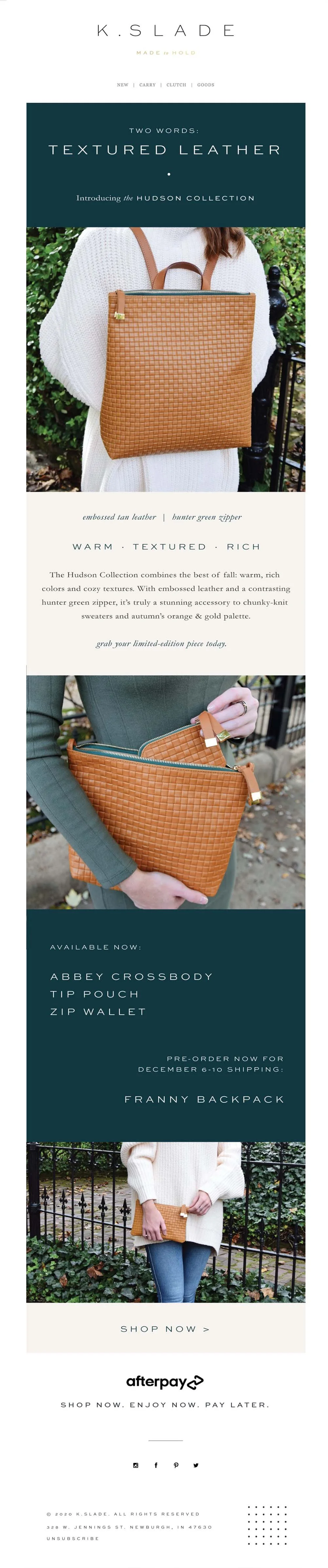 Kelsea Slade, creator of K.Slade, is not only a luxury leather goods designer, but also an advocate for women in business and entrepreneurship. Her American heritage line of classic goods, featured on Darling and beyond, includes pieces made to carry for years - from backpacks to classic clutches and zip wallets made to nestle inside. The best part? Each piece is completely designed and manufactured in the USA. And to make things even better, all components of the bags are sourced from American manufacturers too.